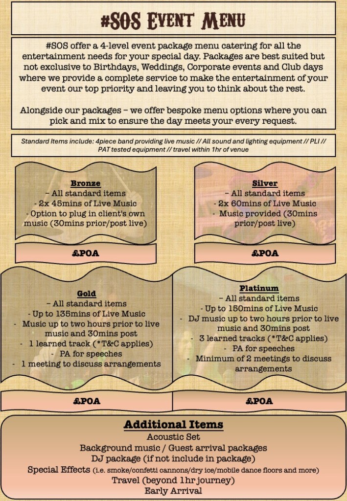 We routinely entertain a number of you at a range of Pubs/Clubs/Social Clubs through the Home Counties and further afield… any proprietor who would like to book #SOS for their venue should contact us via our Social Media account or the Contact Us form on this website.